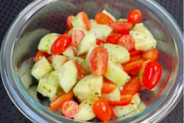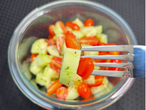Try to cut the cucumber and tomatoes to be roughly the same size. If you want to use an oil, start with only one teaspoon. Use a large spoon or spatula to coat all of the cucumbers and tomatoes before trying it. Add a half a teaspoon at a time from there.  You really don’t want too much. Â