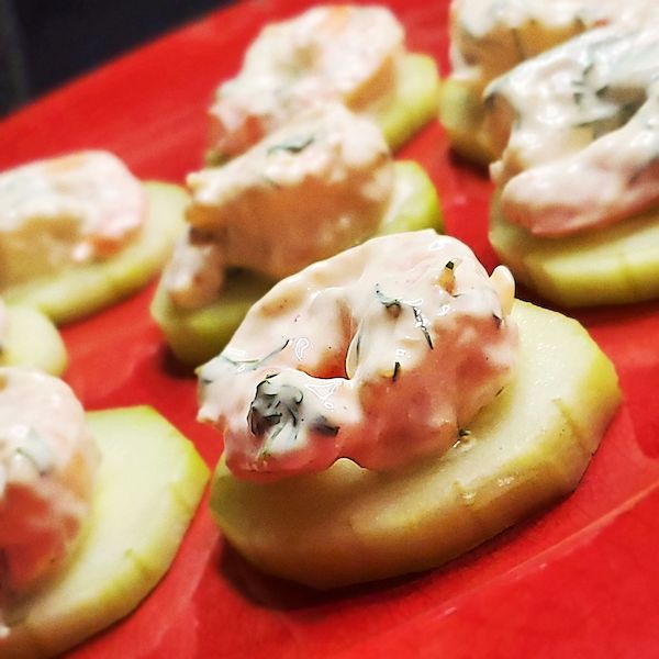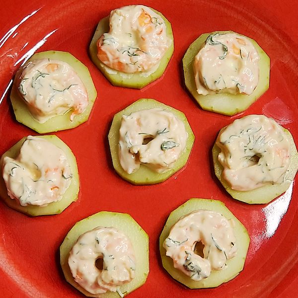 5 – Lay out the cucumber slices flat on a serving tray. Place one piece of shrimp on each cucumber. Sprinkle dill and if adding caviar do that too.