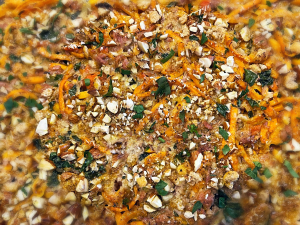 Ingredients- 1 pound of sweet potato noodles1 pound of canned tuna packed in water2 freshly diced celery stalks2 freshly diced carrots¼ cup of chopped almonds or almond meal (texture preference)1 tablespoon of garlic infused olive oil, bacon fat or gheeSalt and pepper to taste1 small diced onion and 1 clove of minced garlic *omit for low FODMAP For the sauce-1 ½ cup of chicken stock, preferably bone broth½ cup of almond milk (can use coconut milk, the kind for drinking)¼ cup of freshly chopped parsley1 tablespoon of dried oregano1 tablespoon of dried basil